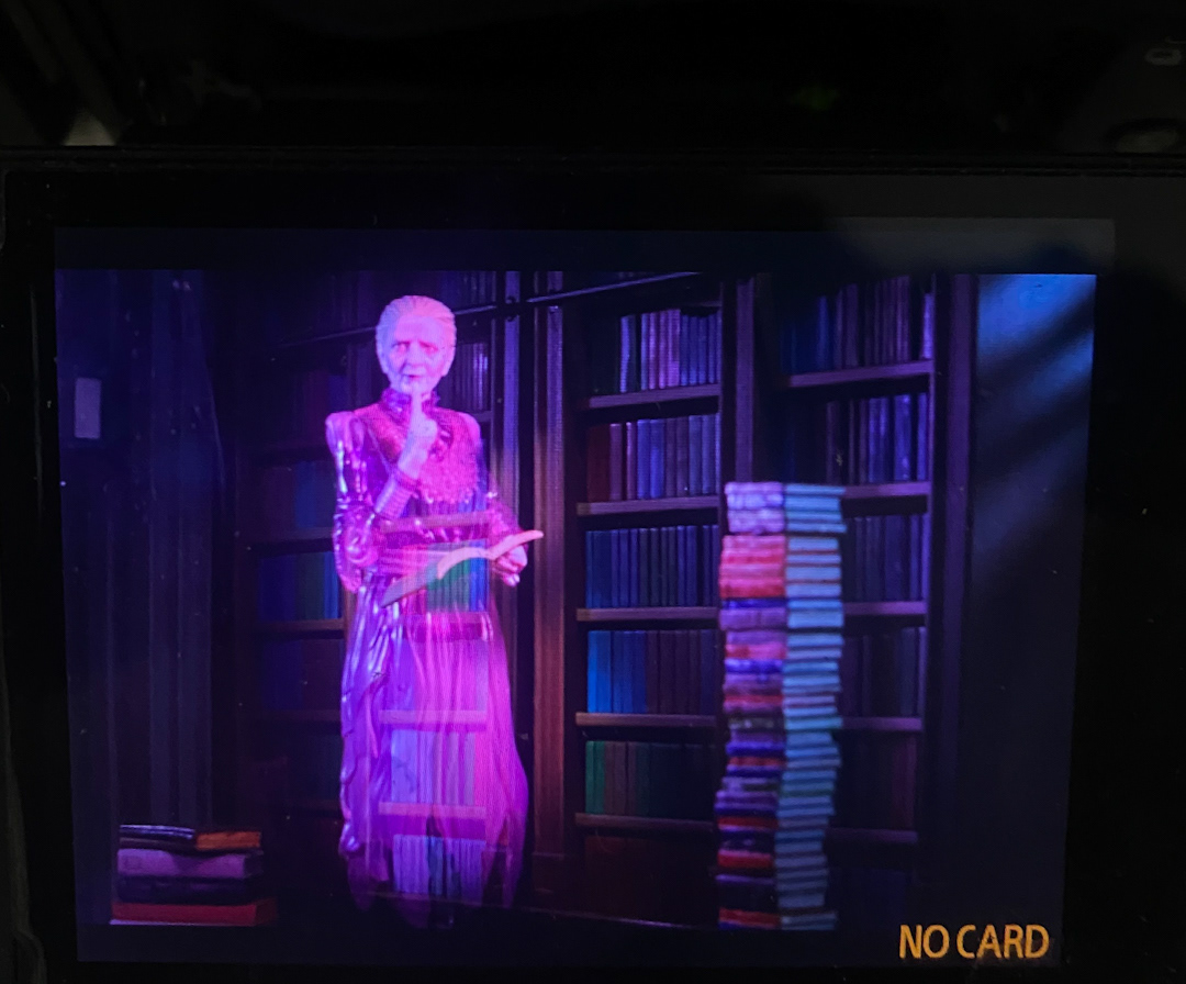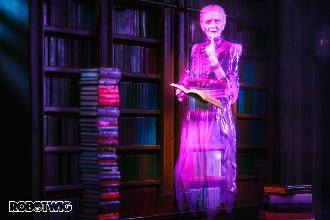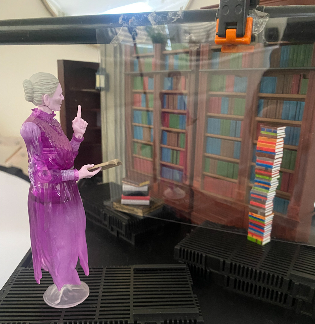 I shot this scene using and old theatrical trick called 'Peppers Ghost' which involves placing a piece of glass at an angle and reflecting the figure into the glass, when the figure is lit it gives that transparent ghost effect into the glass without the need for any digital fudgery. Then once the shot was done I digitally darkened the book she's holding to make it look solid and then flipped the photo to replicate the original scene.